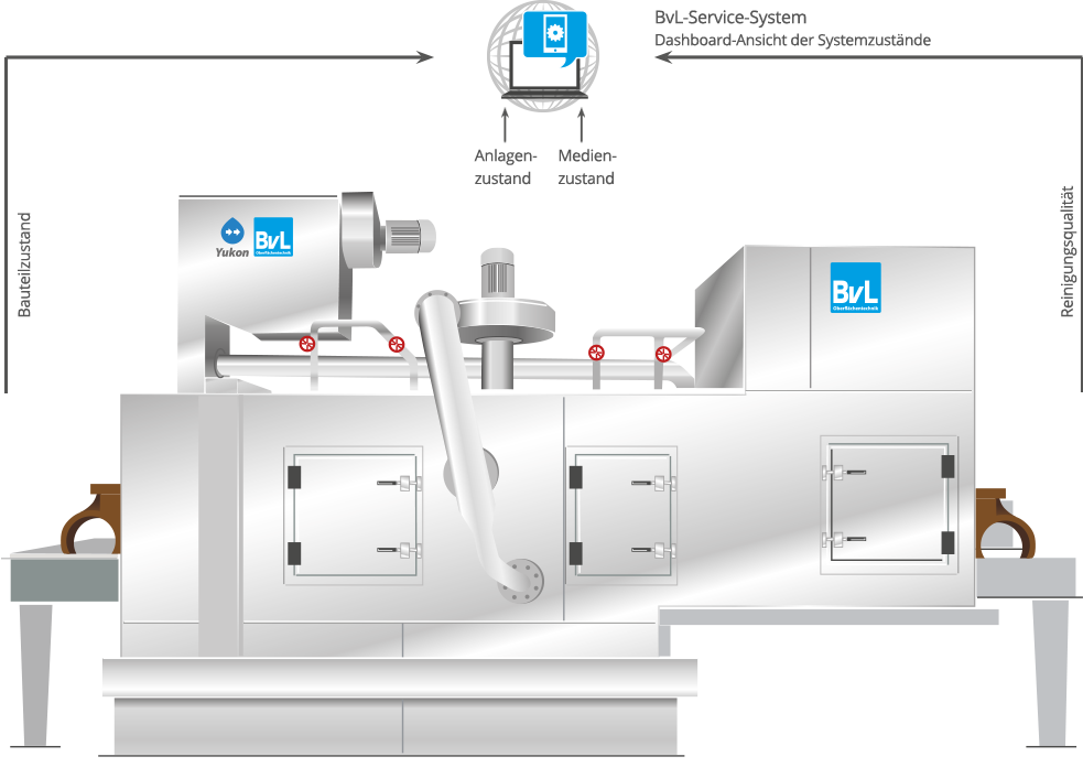 Smart Cleaning verleiht BvL-Reinigungsanlagen „Intelligenz“. Veränderungen zeigen die verschiedenen Smart Cleaning Apps sofort an. Teilprozesse regeln sich selbst automatisch. Bei diesen intelligenten Prozessen ist ein Eingreifen des Bedieners nicht mehr erforderlich.