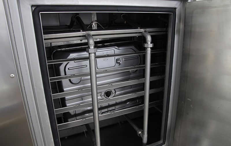 An overhead conveyor transports the oven inserts through the BvL cleaning system on two lanes. Both lanes can be operated independently. In the process, the parts are cleaned, rinsed and dried in several directly consecutive steps. After cleaning, the parts are free of oil, dirt and salt residues. An effective combination of air-blast and drying zones ensures the reliable removal of unwanted residual moisture. This also applies to folded edges and undercuts in particular.